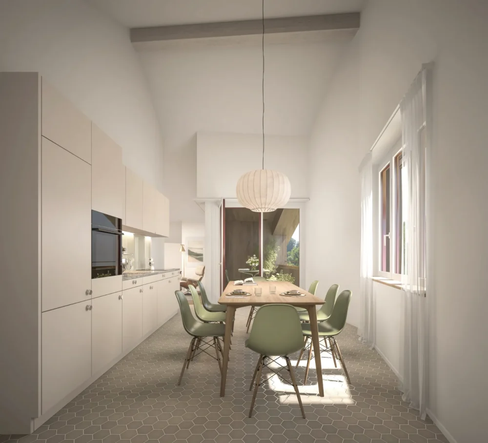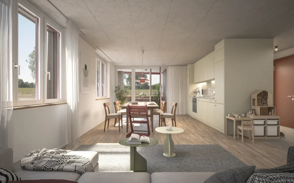 Mit Stil und Komfort: Eichenparkett, Free-Cooling, moderne Küche, Waschturm – und der Blick ins Grüne inklusive. Bild: Wohnung VI.0002 (oder V.0001 gespiegelt).