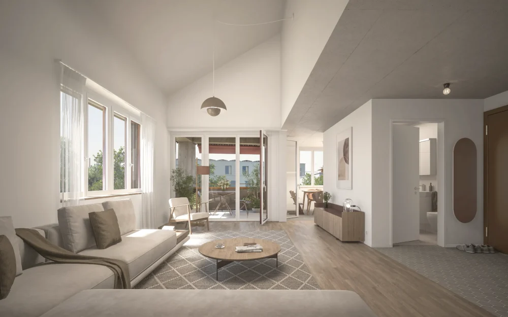Wohnbereich und Loggia der Wohnung IV.0202 / VI.0202 (oder V.0201 gespiegelt).
