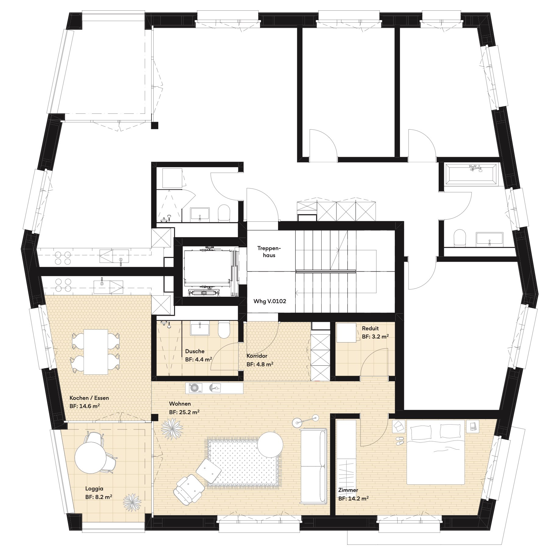 Langholstrasse 14Wohnfläche 66.6 m² Loggia 8.4 m² Kellerabteil 8.6 m²